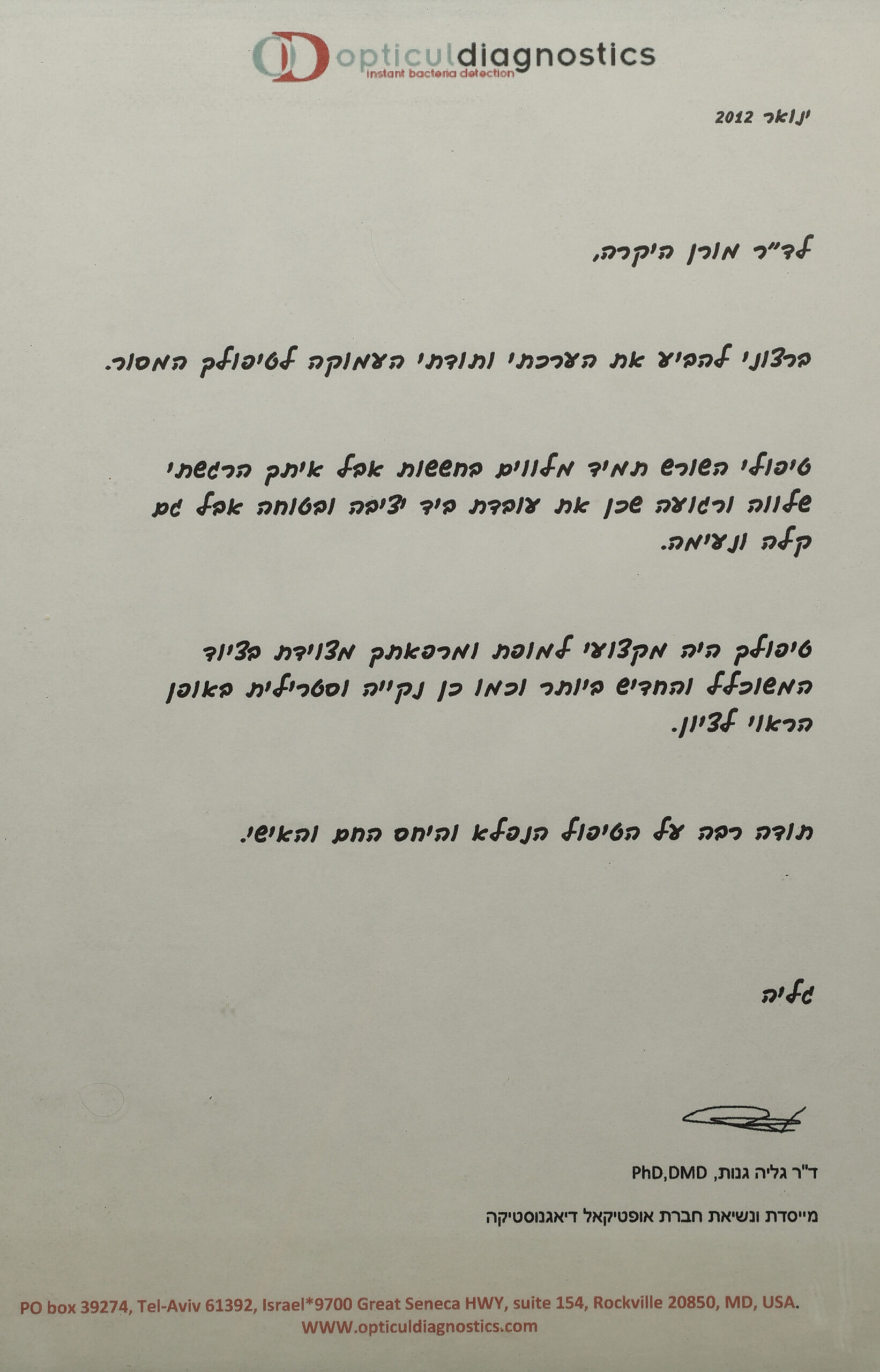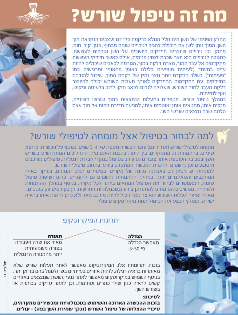 בעלת נסיון רב באלפי מטופלים בטיפולים אנדודונטליים (טיפולי שורש) תוך שמוש במיקרוסקופ דנטלי לטיפולים לאחר חבלות דנטליות כולל בעזרת "גז צחוק". הטיפולים מתבצעים בקליניקה משוכללת ומודרנית בתל אביב.